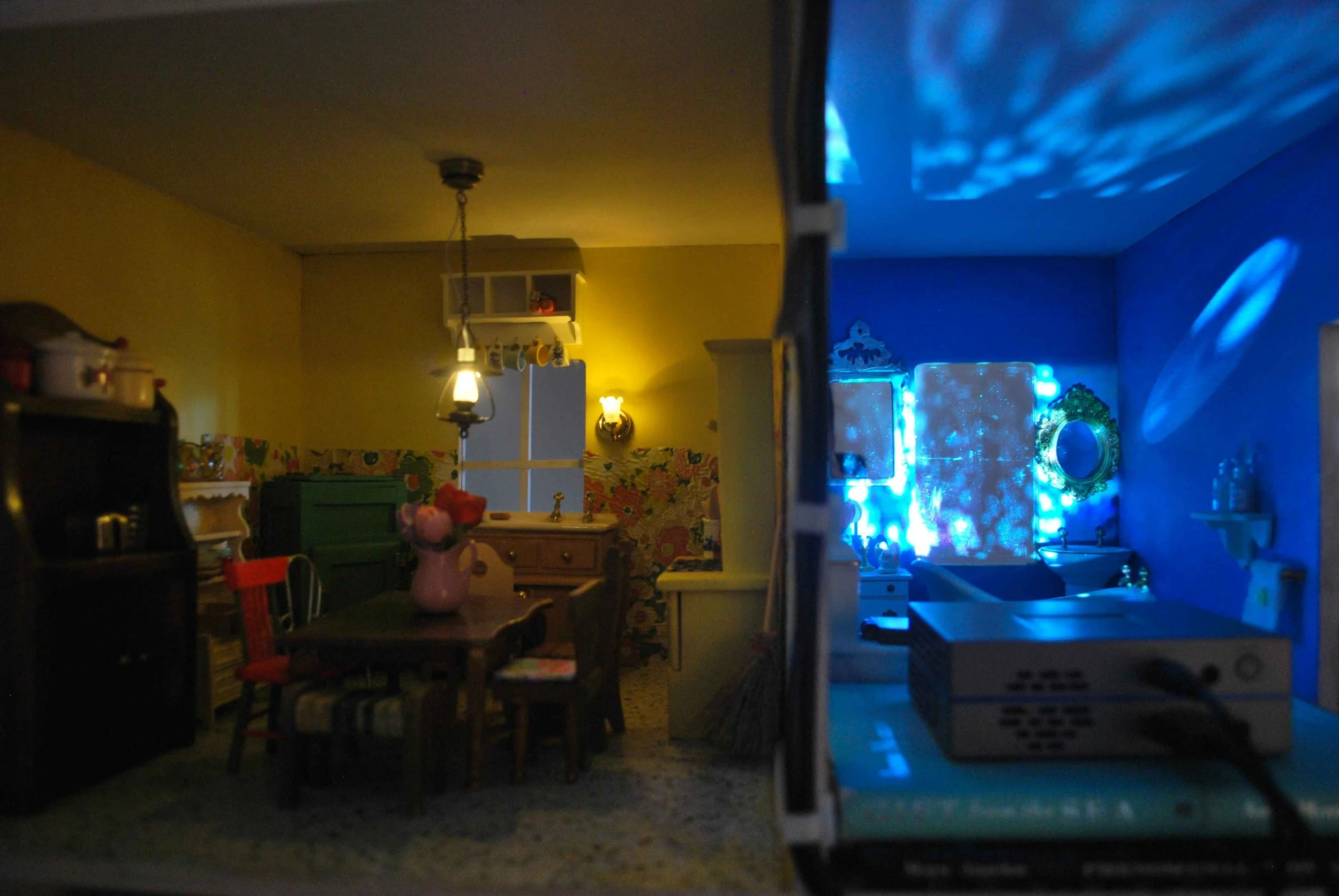 After releasing that body of work, I wanted to focus on the light. I wanted to show gratitude to my loved ones who stood by me through my pain, and my subsequent healing process. My current project, infinitlovalie, is a multimedia installation with video projections emanating from inside of an altered dollhouse. Each room of the dollhouse reimagines the rooms I grew up in, honors members of my family, and pays tribute to tender memories from my childhood. Projectors are placed inside three rooms of the dollhouse, propped up by a foundation of books that have either made a significant impact on my life, or contain messages that I hope to convey to my family.