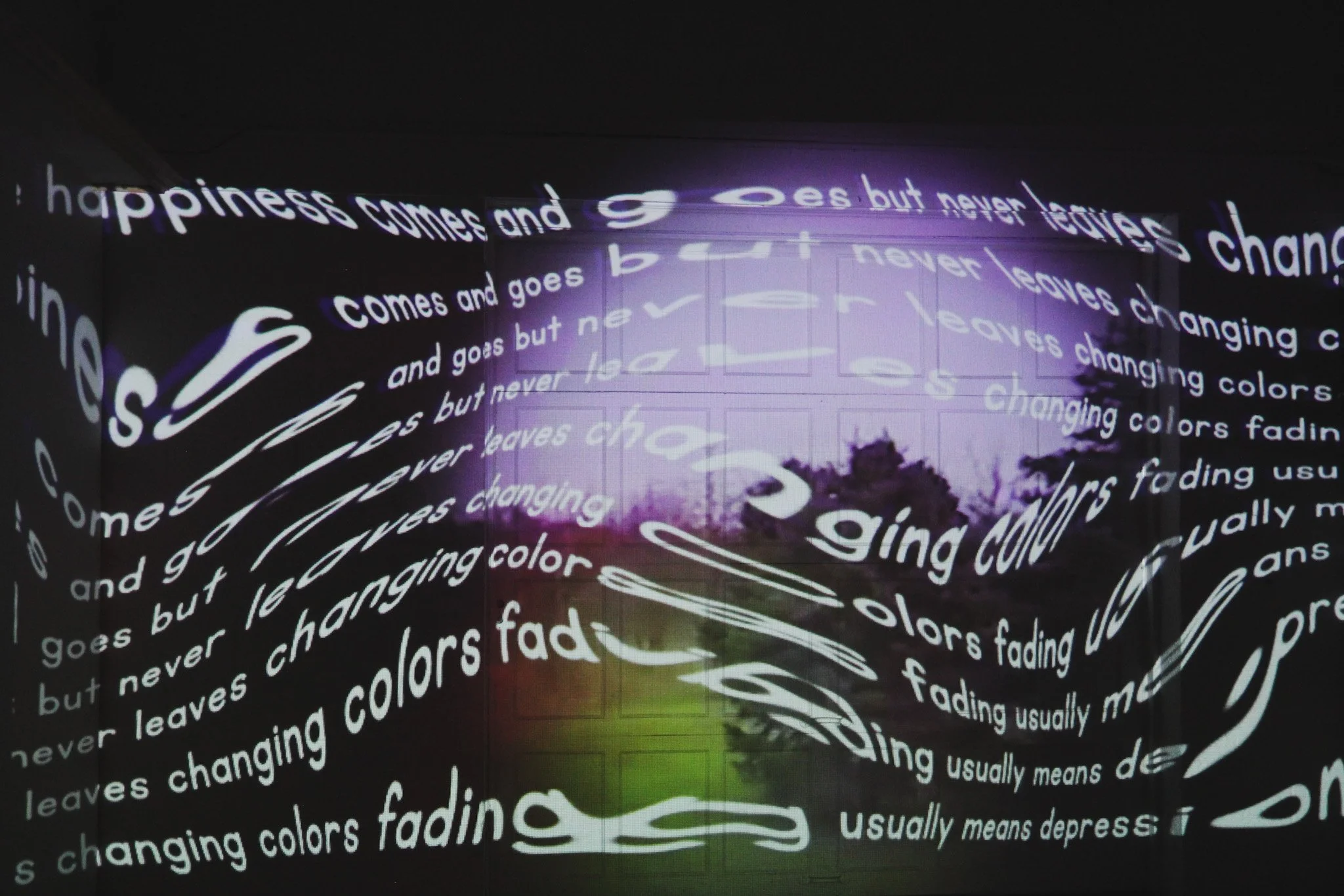 On the gallery wall that straddles the projected diptych and its opposing reflected mirror image, a much larger video is projected. A stream of ten lines of text ebbs and flows, rippling and branching out, similar to a river. The text is staggered in orientation, allowing it to be read not only left to right, but vertically. The video art is based on a series of poems that I wrote while in a meditative state. Each poem is meant to honor a different member of my family: Saturn Return for my mother, Sounds of Nature for my mother’s side of the family and our cottage in New Hampshire, Little Jonny Appleseed for my brother, and Dear Ol’ Dad for my father. Each word or phrase runs into the next, never finishing the thought, while simultaneously starting a new one. There is no sentence structure, in fact, there are no sentences. Some of the words are made up, or a combination of multiple words. The first and last words of each poem continue the flow, so that the poem has the ability to repeat indefinitely. I call them “infinity poems,” and I believe they came from someplace higher.